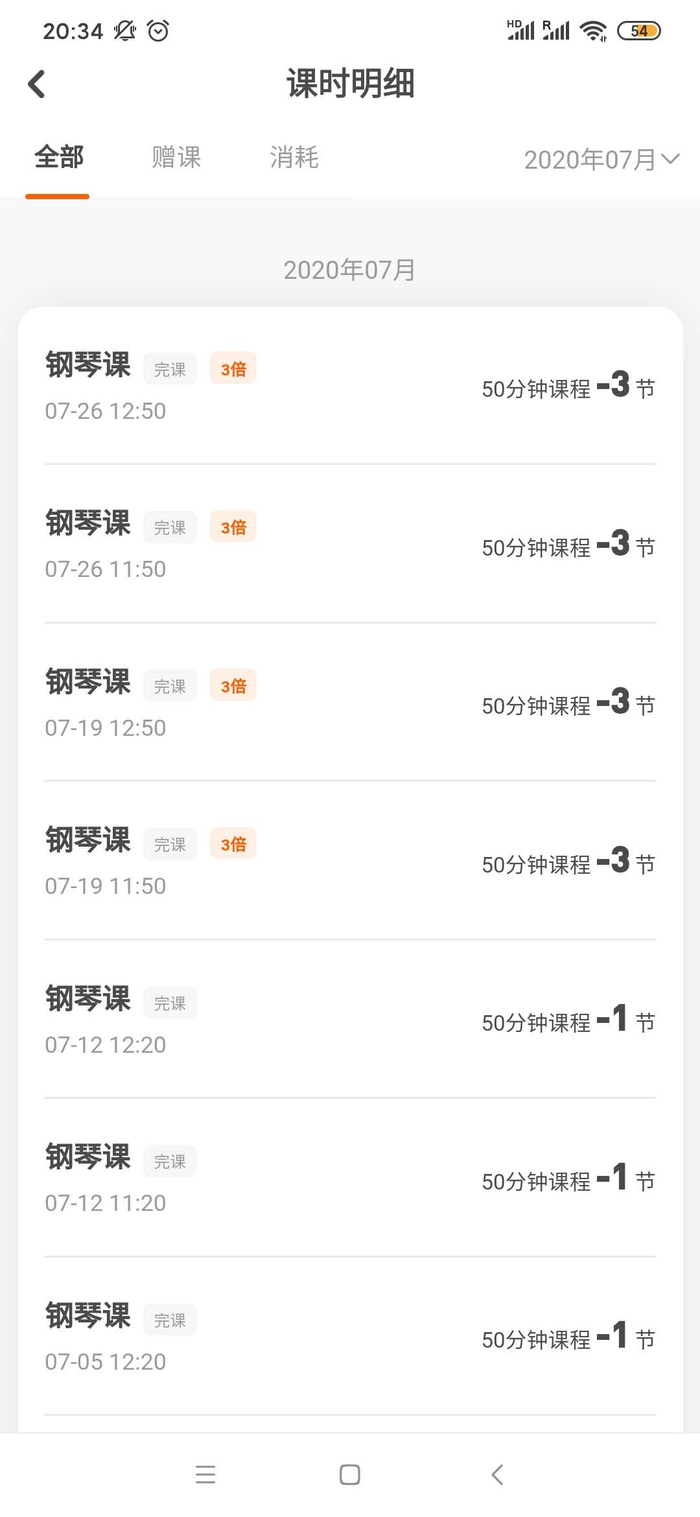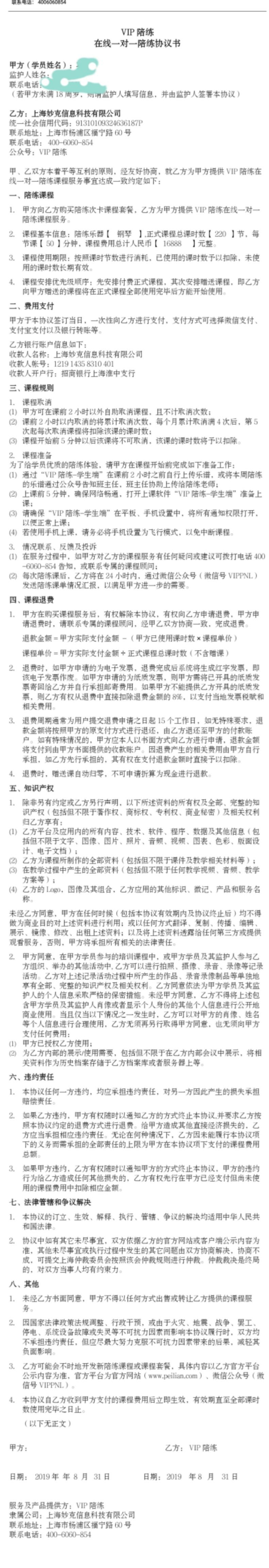 2019年8月,马女士为孩子在VIP陪练购买了16888元的钢琴陪练课程,含260节主课和40节赠课,共计300节。马女士告诉记者,刚开始上课时VIP陪练采取“上一堂课扣一课时”的计费方式,且培训平台所有老师并未划分等级。销售人员向她承诺,所有老师可以任意选择更换,直到家长满意为止。当年9月,VIP陪练突然单方面修改计费方式,将陪练老师的课时按单节课时的1至3倍计算。由于马女士一直选择同一位老师,因此计费方式仍然按照上一堂课扣一课时的方式计算。