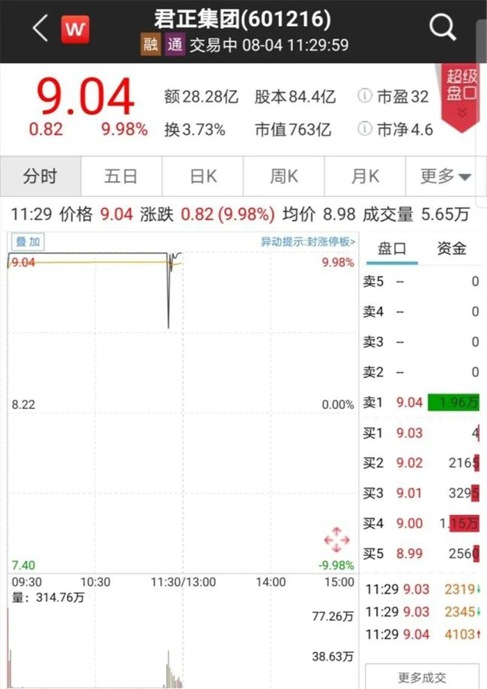 截至午间收盘,君正集团虽然股价维持涨停价格,但涨停价上仍有1.96万手的卖单未被消化,显示涨停板并未封死。