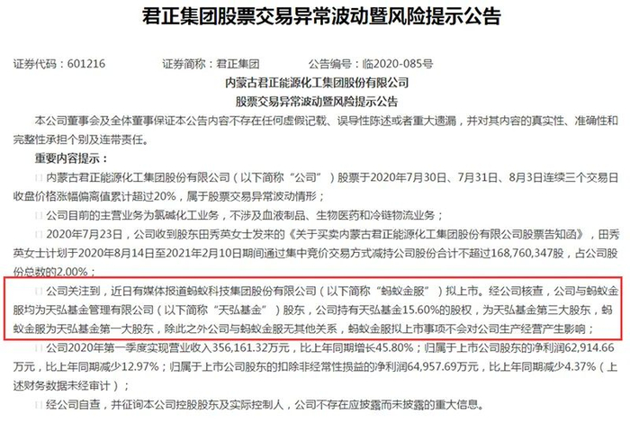 其次,君正集团本轮11天10板的首个涨停发生在7月21日,当天正是蚂蚁金服官宣A股上市计划后的首个交易日。