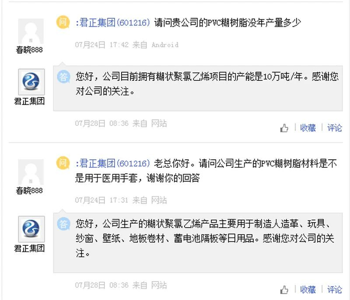 君正集团回复投资者有关PVC糊的提问