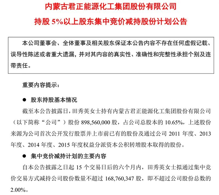 根据公告,君正集团持股5%以上股东田秀英拟自公告披露之日起15个交易日后的六个月内,通过集中竞价交易方式减持公司股份数量不超过1.69亿股,即不超过公司股份总数的2%。