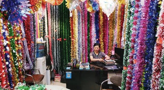 56岁的陈爱玲在义乌国际商贸城经营一家以彩条为主要产品的商铺已有22年了。在世界各地用来装扮圣诞节的彩条中,平均每十件中至少有八件都从义乌出口。但在过去几个月,她的生意一直惨淡。