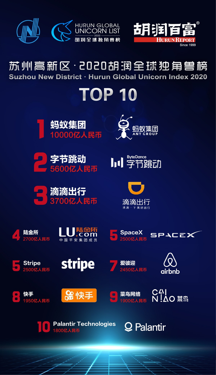 在排名前十的独角兽企业中,中国企业占据六席,前三名位置与2019年相同。