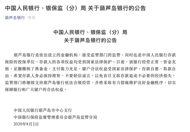 8月3日,央行葫芦岛市中心支行、中国银保监会葫芦岛监管分局联合发文称,葫芦岛银行各项存款余额达834亿元,经营良好,请广大储户不要轻信谣言,避免盲目支取存款带来的不必要损失。