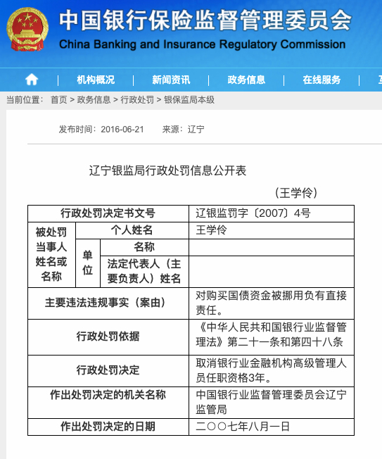 在2007年8月1日原辽宁银监局作出的处罚决定中,王学伶因“对购买国债资金被挪用负有直接责任”,被取消银行业金融机构高级管理人员任职资格3年。