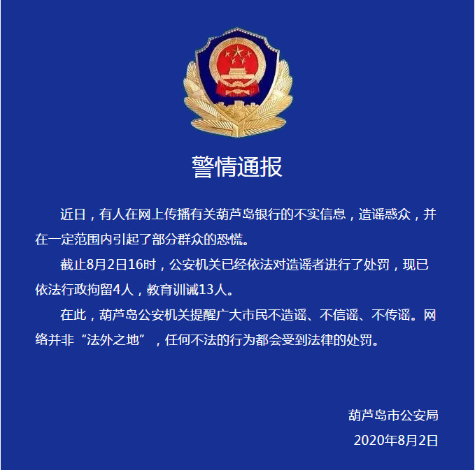 此外,葫芦岛市公安局也在前一天发布警情通报,指出近日有人在网上传播有关葫芦岛银行的不实信息,造谣惑众,并在一定范围内引起了部分群众的恐慌。截至8月2日16时,公安机关已经依法对造谣者进行了处罚,现已依法行政拘留4人,教育训诫13人。