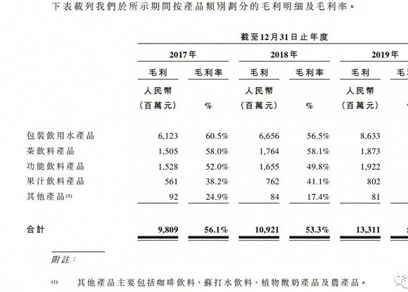 另外,不得不提的一点是,农夫山泉在招股书中披露的超高毛利率。招股书显示,2017年-2019年,农夫山泉包装饮用水的毛利率分别为60.5%、56.5%与60.2%。而茶饮料产品和功能饮料产品的毛利率也均在接近或超过50%的水平。