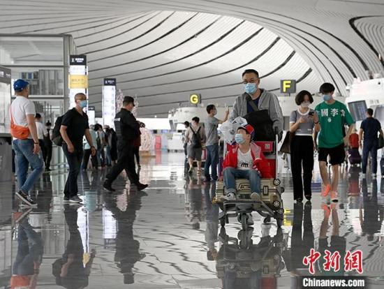 6月3日,旅客在北京大兴国际机场出发层准备出行。中新社记者 侯宇 摄
