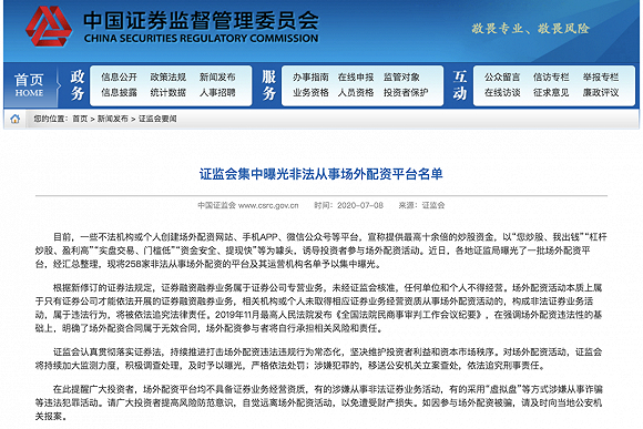 7月8日,证监会曝光了258家非法从事场外配资的平台及运营机构名单,并发布新闻称,一些不法机构或个人创建场外配资网站、手机App、微信公众号等平台,宣称提供最高十余倍的炒股资金,以“您炒股,我出钱”“杠杆股、盈利高”“实盘交易、门槛低”“资金安全、提现快”等为噱头,诱导投资者于场外进行配资活动。