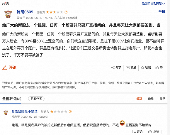 “给广大的新股友一个提醒,任何一个股票群只要开直播间的,并且每天让大家签到,当听到要万人建仓,有30%至50%上涨空间的,你们就立刻退群吧,是往下砸30%让你们接盘,更不能听群主在场外再开个账户,群里还有很多托,让把你们正规交易所资金转到群主指定账户,那就本金也沒了,千万不要再被骗了。” 一位股民在济民制药的股吧里发出如是感叹。