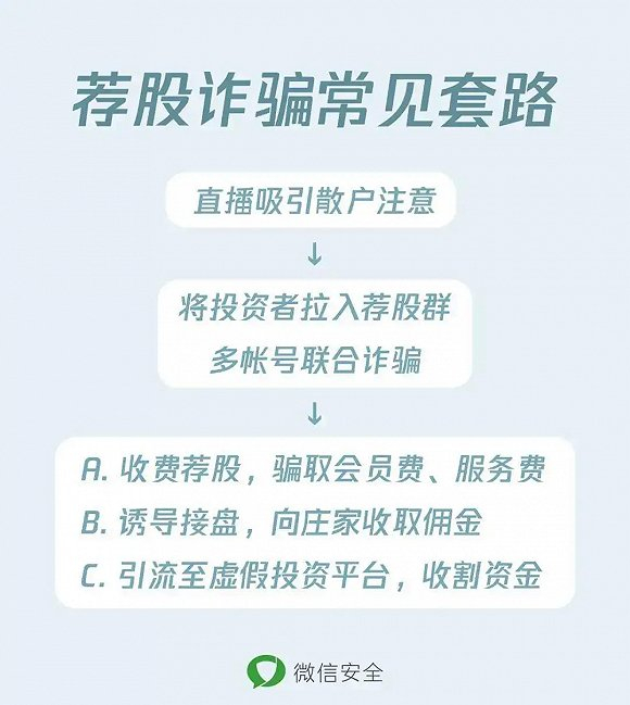 近日,微信官方安全中心也发文提醒用户,称需要警惕荐股诈骗套路。公告中指出:一些荐股群里的投资者,大多是被“大师”的网络直播所吸引,“大师”和“助理”以及“粉丝学员”全部都是诈骗团伙操控的账号,荐股群里的“大师”虽自称“首席分析师”,很多只是涉猎股市的“门外汉”,并没有相关从业资格。他们收取高额的会员费、服务费,给出的建议并不具备参考价值,更有甚者,通过诱骗大批散户接盘的方式向庄家换取佣金。此外,一些诈骗团伙还会冒充正规投资公司,提供虚假投资平台诱骗投资者注资,后续通过在后台实时操纵行情、伪造交易记录等手法欺诈用户大量资金。