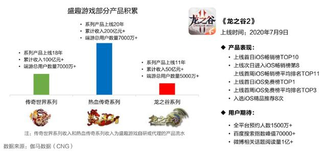 具体来看,世纪华通的核心竞争优势主要体现在两个方面。其一,受益于旗下盛趣游戏产品底蕴,无论是IP储备还是游戏研发能力上世纪华通都获得了补足,国内市场游戏业务加速发展。作为国内成立最早的游戏企业之一,盛趣游戏从端游时期便积累了大量市场高收益产品,现握有多款重量级IP,其中"传奇世界"与"热血传奇"系列产品累计流水均在百亿元级,而基于旗下IP的新作仍居于高收益行列,比如龙之谷全新手游《龙之谷2》上线首周在iOS畅销榜平均排名为第11名。