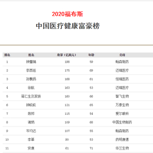 8月4日晚间,福布斯中国发布福布斯医疗健康富豪TOP50榜。