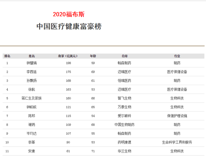 疫情之下,医药公司的股价表现亮眼,福布斯中国最新发布的医疗健康富豪榜单显示,需求的增长也提高了中国上述领域众多企业家的财富。财富增幅之大,令人惊讶。