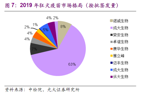 目前狂犬疫苗最为主流的制备工艺依旧是传代细胞疫苗,其中又以Vero细胞狂犬疫苗市占率最高,行业龙头成大生物生产的狂犬疫苗就是Vero细胞狂犬疫苗。2019年,成大生物的市占率接近70%。