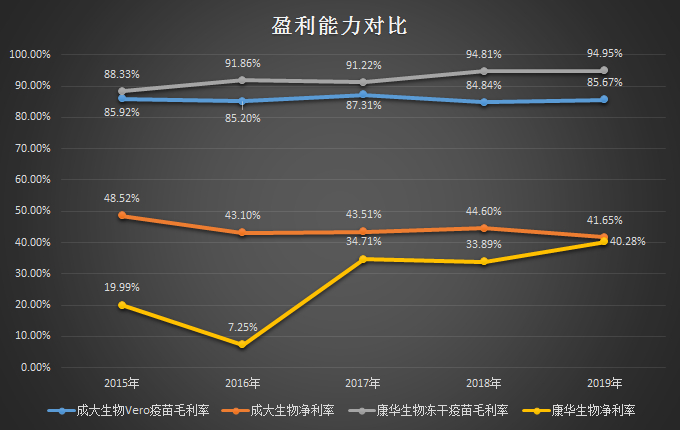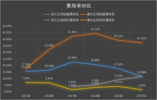 这主要是因为康华生物是国内首家生产冻干疫苗的企业,在推广产品上花费了大量的成本。2017年至2019年,康华生物的销售费用分别占当期收入的42.3%、44.51%和39.13%,远远高出产品较为成大生物的销售费用占比。