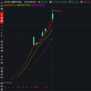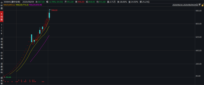 8月4日,康华生物股价继续创下新高,一度逼近千元(最高价996元/股),创下了13倍的涨幅,真的是名副其实的“大肉签”。