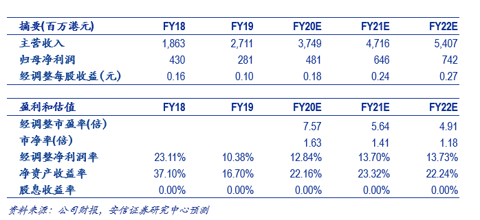 ■在手订单充沛,稳步经营业绩可期:随着管理项目逐渐增加,公司通过经验复制以及标准化运营提高经营效率,实现规模经济,目前已具备在公开招标上取得项目的竞争能力。2020年以来公司先后中标多个环卫项目,包括新桥和沙井街道环卫一体化PPP项目,合约总金额约73亿元,合约期限长达15年。公司在快速发展的同时提高拿单的质量,截止2019年底公司环卫服务总承包面积为约1.5亿平方米(2018年1.42亿平方米),平均收入每平方米10.7港元(2018年为每平方米9.2港元)。随着未来危废项目也逐渐投产后,公司业绩有望进一步增厚。