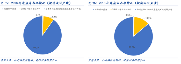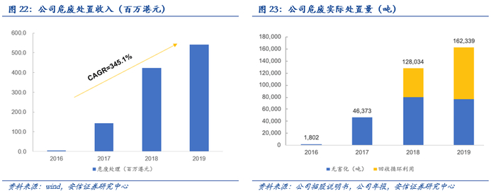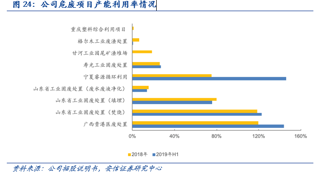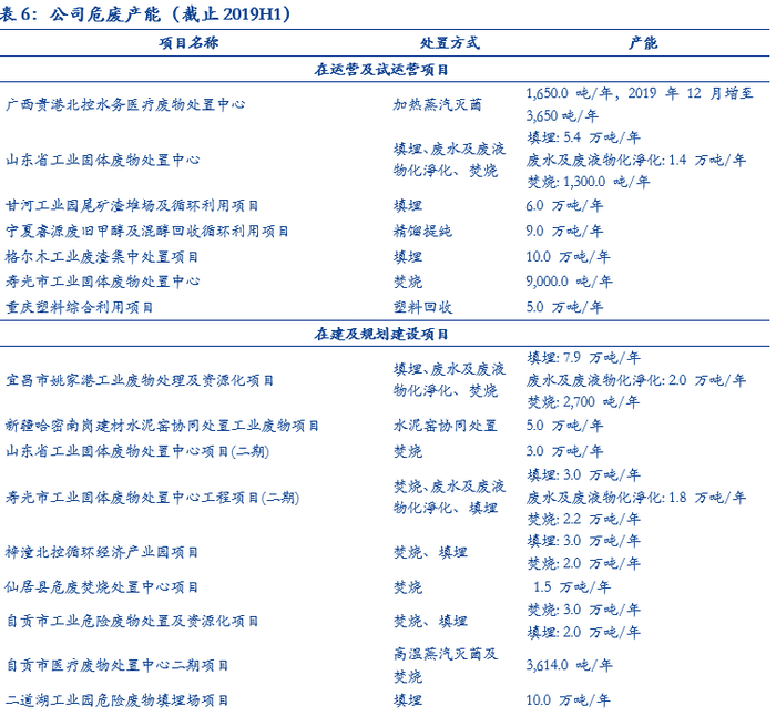 危废处置类别多,新项目产能投放在即。在目前国家危险废物名录所列的 46 大类别危险废物中,公司具有资格处理 38类。处理方式包括目前市面上的全部四种主要方式, 包括焚烧、废水及废液物化净化、固化及填埋处置。公司还将业务延伸至回收循环利用工业废物中的材料。通过收购宁夏睿源切入废旧甲醇及混醇回收循环利用。截至 2019 年 12 月底,公司有6个在营危险废物处理项目,2个试营危险废物处理项目,5个在建项目,4个规划建设项目。以处理量计算,公司危险废物处理业务的实际处理量由2017 年的 4.6 万吨增加 176.1%至 2018 年的 12.8 万吨,并于 2019 年增长至 16.2万吨。根据公司招股说明书,按2018年在营项目(包括试营项目)废物处置设计产能计算,公司在全国危险废物处理服务市场排名第6,市场份额达0.7%。