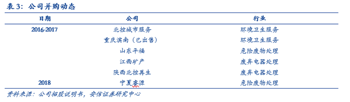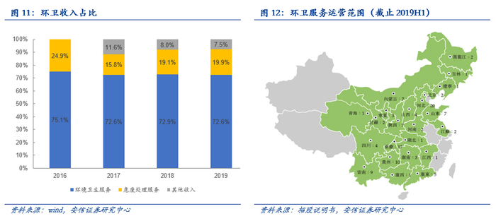 并购布局环卫和危废领域。和业内其他环卫服务公司以内生为主的发展路径有所区别,公司通过内生增长和外延并购相结合快速发展。2016至2018年期间,公司陆续收购整合北控城市服务和重庆滨南扩大环卫业务,收购山东平福和宁夏睿源来提高危废处置产能,完成环卫和危废处置双主线的业务布局。根据招股说明书,截止2019H1,公司合计拥有84间从事提供环境卫生服务的附属公司、29间从事提供危险废物处理服务的附属公司及三间从事提供废弃电器及电子产品处理服务的附属公司,业务覆盖我国28个省及直辖市地区。