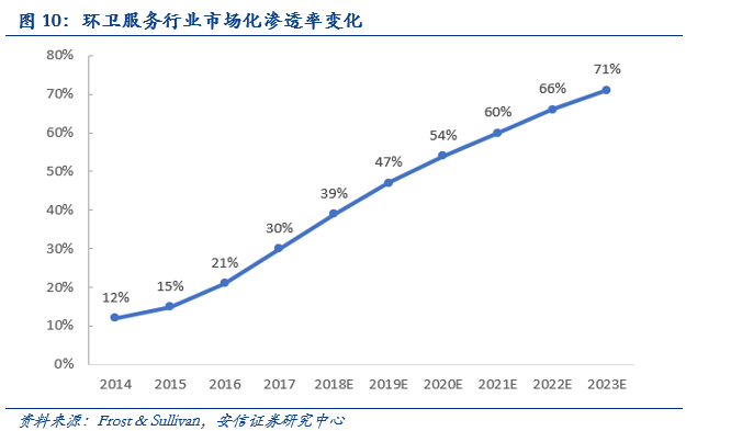 行业龙头市占率有望进一步集中。一直以来,环卫市场呈现出环卫企业小而多、市场格局散而乱的局面。行业内企业规模小的偏多,受产能和资本限制,大部分也只能承接小型合同。由于大量中小企业纷纷涌入行业,依托地方资源优势获得订单,环卫行业集中度较低。目前环卫龙头渗透率较低,处于大面积推广发展的阶段。参考发达国家的发展规律,环卫市场化率到60%以上才达到成熟水平。因此,在当前政府对环卫服务日益提高的标准要求以及有限的财政支付、管理能力约束下,环卫市场化是环卫领域大势所趋。根据Frost & Sullivan的相关研究测算,认为2020年环卫服务的市场化渗透率将首次超过50%,并且未来还有进一步提升空间。