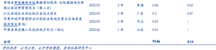 市场化推进促行业准入门槛水涨船高,龙头公司显著受益。目前环卫市场化处于大面积推广发展的阶段,环卫市场呈现出环卫企业小而多、市场格局散而乱的局面,环卫龙头渗透率较低。行业内企业规模小的偏多,受产能和资本限制,大部分也只能承接小型合同。由于大量中小企业纷纷涌入行业,依托地方资源优势获得订单,环卫行业集中度较低。但是随着环卫行业市场化的推进,企业间的竞争体现在资源背景、管理运营经验、服务质量、品牌、资本实力、报价等多个方面,中小型环卫服务公司或受挤压严重。从新增订单集中度来看,北京环境、龙马环卫、北控城市服务、玉禾田、侨银环保等新增市场份额排名靠前。大型环卫一体化项目所要求的综合能力不是小型公司能够短时间补足的,环卫服务市场份额将快速向龙头集中。以深圳市宝安区新安、福永和福海街道环卫一体化PPP项目为例,年服务费为5.6亿元/年,服务期限15年,总合同金额达78亿元,是迄今以来国内最大的环卫一体化项目。2020年4月开始招标,公告中对企业的财务状况提出了很高的要求,单财务要求就将国内一大批中小环卫企业拒之门外,最终通过资格审查的共有24家企业。随着国内环卫一体化项目越捆越大,政府对社会资本方的要求将水涨船高,未来优质大项目更趋向于赢者通吃,强者愈强。