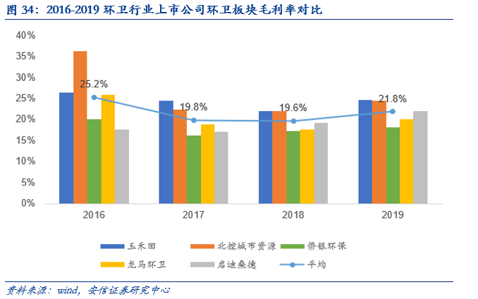 行业进入良性竞争,整体规模效应初显。我们选取了5家上市公司对比了2016-2019年环卫业务的毛利率发现均经历了毛利率下滑的阶段,而环卫行业作为劳动密集行业,其成本主要来自人工。我们认为期间几年毛利率下滑主要是由于劳动成本上涨以及设备折旧导致。而进入2019年后毛利率有所回升,我们认为行业龙头的经营效率提升导致,也就是说头部企业的已经能够产生规模效应。