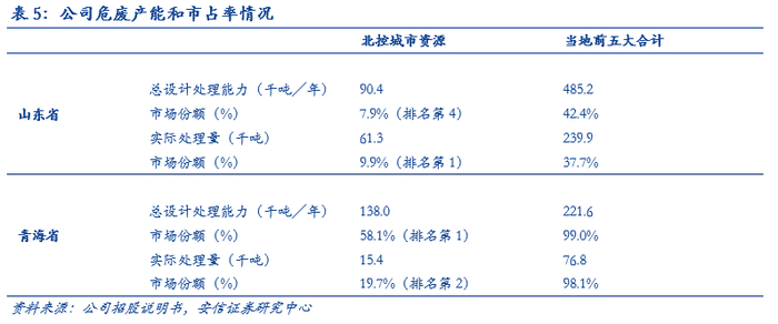 精准卡位产废大省,地域优势明显。我国危险废物产生量与处理能力分布不均。拥有较多工业企业的省份(如山东省、内蒙古及青海),其2017年危险废物产生量占当年全国危废总产量38.4%,但是危废处置的总设计处理能力相对较低,占2018年中国危险废物处置的总设计处理能力的4.2%。由于分布不均,工业企业多的省份面临处理设施不足的情况。从处置产能来看,公司在山东和青海的危废处置能力均位于当地前列,分别排名第四及第一。