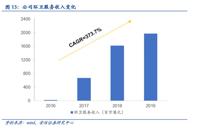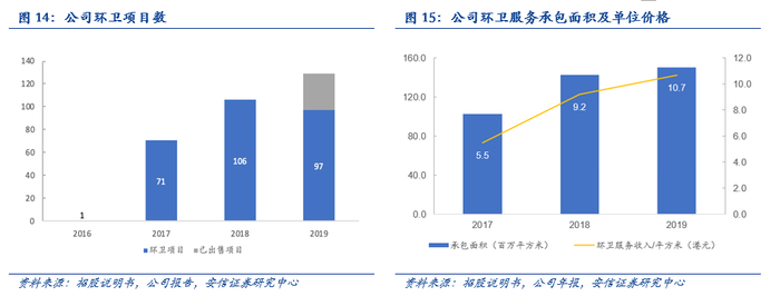 量价齐升,环卫业务高速增长。公司环卫服务业务保持着高增速,2016年仅1个项目,贡献收入1656万元,2019年环卫收入增长至19.7亿元,CAGR高达373.7%。公司环卫业务高速成长的背后一方面来自环卫项目数量大幅度增加,另一方面环卫服务单位面积价格也有所提高。公司2018年环卫项目已经突破100个,2019年底环卫项目总数97个,全年新增项目33个,总项目数减少的原因是公司出售了重庆滨南导致。但是总承包面积有所增加,可见公司在高速发展的同时也提高拿单的质量。截止2019年12月31日,公司环境卫生服务项目的总承包面积为约1.5亿平方米(2018年1.42亿平方米),平均收入每平方米10.7港元(2018年为每平方米9.2港元)。