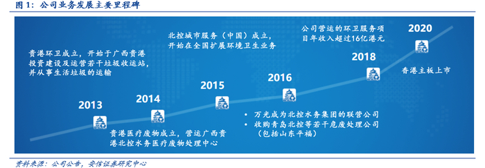北控城市资源集团有限公司(以下简称“北控城市资源”)是北控水务(0371.HK)旗下的环卫服务与危废处置公司,战略定位于“专业的城市环境与资源利用综合服务商”。公司前身成立于2013年,当时北控水务(广西)成立贵港环卫,开始在广西贵港投资建设及运营垃圾收运站,从事生活垃圾运输。2014年7月,北控水务(广西)成立贵港医疗废物,开始运营广西贵港北控水务医疗废物处理中心。2015年北控城市服务和万光成立,前者开始在全国扩展环卫业务,后者于2016年成为北控水务联营公司,作为危废处置的平台公司。2019年3月26日北控城市资源于开曼群岛成立,作为投资控股公司,并不涉及运营业务。2020年1月北控城市资源于港交所主板上市。