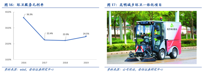 智能环卫助力高效管理,毛利率持续提升。2019年公司环境卫生服务的毛利率上升至24.5%,同比提高2.45pct,主要由于公司有效控制经营成本,持续专注于提升营运效率,并于业务流程中运用先进技术。公司推出试点项目,要求环卫工佩戴数字手环并在每辆车辆上安装全球定位系统追踪器,并在清洗车上安装远程燃料监控器。因此能实时追踪环卫工及清洗车的工作进度以及车辆的燃料使用。透过此类设备收集的资料会传输至云端平台,而综合管理平台根据收集的资料进行实时监控及评估。通过科技打造智能环卫能促进提高营运效率,从而增加环卫服务的利润。
