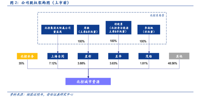 北控系绑定,利益共同体促发展目标一致。根据招股说明书,上市前北控水务集团 (00371.HK) 持有公司股权比例为35.0%,是第一大股东。值得注意的是,尽管公司股权看似分散,但是其背后控制人均为北控系董监高及核心管理人员,通过上海自阅、茂临、星彩、至华等平台持有公司上市前总股本的 16.44%。公司上市后大股东和管理团队持股比例分别稀释至26.25%和12.3%。公司通过管理层持股建立了长期利益共同体,实现所有者和经营者的发展目标一致,利于公司长期发展。
