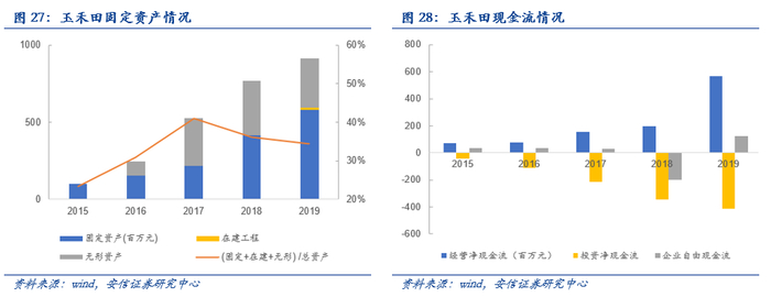 而以玉禾田为典型代表的环卫公司,资产属性偏轻,(在建工程+固定资产+无形资产)/总资产的比例相对较低,尤其的固定资产部分。另一方面由于环卫是劳动力异常密集行业,地方财政部门往往按照月度或者季度支付环卫项目服务费,因此项目应收账款账期普遍较短,经营现金流水平较好。同时环卫新项目的所需投资额相对较小,主要是环卫设备相关开支,故自由现金流通常为正。
