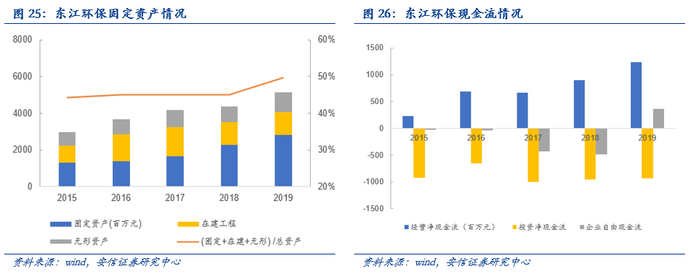 以东江环保为例,(在建工程+固定资产+无形资产)/总资产的比例一直保持在40%以上,尽管经营现金流良好,但是每年资本开支通常较大,自由现金流往往呈负数,因此对公司现金流周转要求较高。