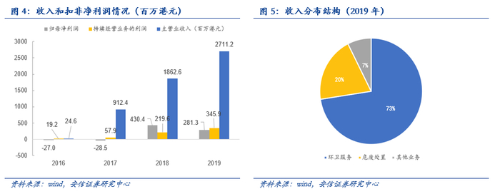 公司近几年业务保持高速增长, 2016年至2019年营业收入复合增长率高达379.2%,2019年实现收入27.1亿港元,同比增长45.6%。归母净利润为2.81亿港元,同比下滑34.6%,主要原因是处置了重庆滨南及相关业务。但是通过对比公司持续经营业务的利润情况,一直处于高速增长状态,2016至2019年复合增长率为162.3%。公司收入来源分为三大部分:环卫服务,危废处置以及废弃电器、电子设备处理。环卫服务是公司的主要收入来源,近3年均保持在总收入70%以上的水平。我们认为公司业绩快速增长的背后主要有两点:一方面是公司的环卫服务项目在不断增加,从2016年的仅1个项目增加到2019年底的97个;另一方面是公司布局的环卫服务和危废处理行业,均处于高速增长的轨道。