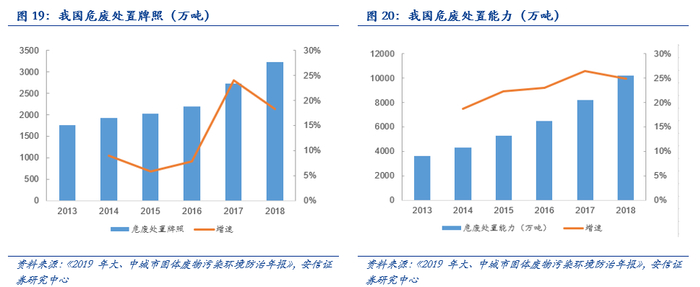 处置资格和资本投入带来准入壁垒。我国要求公司须持有危险废物经营许可证才能开展危险废物处理业务。而考虑到危废处置的危险性及重要性,监管机构仅将经营许可证授予具有行业经验及专业知识的企业,并且牌照的获取时间通常较长。根据《危险废物经营许可证管理办法》,拥有三项或以上技术且拥有三年以上行业经验以及配备合资格废物运输及处理设施的公司才能取得收集、贮存及处置危险废物的综合经营许可证。根据环保部,截至 2018 年全国共颁发危废经营许可证 3220 份,全国核准的处置产能为10212 万吨/年。另一方面来看,危废处置是资本密集型行业,处理设施通常需要大量资本投资。相关的大量经常性投资要求行业参与者拥有雄厚的资本实力及融资能力。
