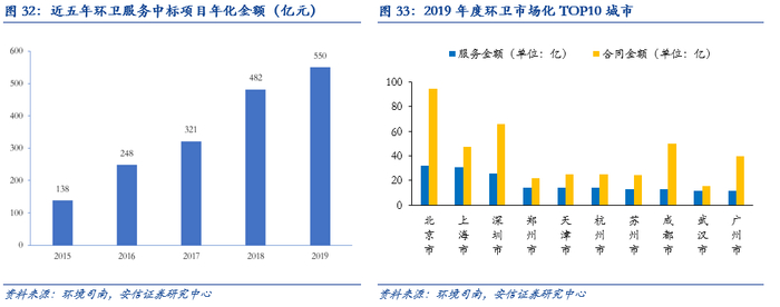 环卫市场化推进从一线城市逐渐深入。十九大以后,环卫行业的“政事分开、事企分开、管办分离”改革进程将加速,环卫市场化也将由此更加彻底、更加深入的推进。环境司南数据统计显示,2019年度开标项目年化总金额在550亿元左右。从2015年138亿到2019年550亿,从百亿级到五百亿级,短短五年时间,全国环卫服务市场“中标项目年化金额”一年一个台阶,可见环卫行业市场空间和市场化程度快速发展。数据同时表明2019年度环卫市场化城市排行榜共有289座城市上榜,其中4个直辖市、285个地级市(含“天门市、仙桃市、潜江市”三个省辖市)。289个上榜城市中,2019年度开标环卫服务项目年化额超过10亿元的城市有10个,分别为北京市、上海市、深圳市、郑州市、天津市、杭州市、苏州市、成都市、武汉市和广州市。其中,北京和上海年化额超过30亿元,深圳市年化额接近26亿元。今年以来已有超过10个10亿级别环卫项目出现。在目前环卫一体化趋势下,拥有资金、经验、品牌、地域优势的龙头企业将优先受益。根据环境司南统计,广深地区从2019年便陆续开标重磅级项目,而2020年截止目前全国10亿级以上的项目总额已达271.12亿元。