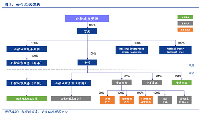 北控城市资源成立以前,业务通过不同的经营实体进行营运,2015至2017年期间集团进行一系列的重组转让,万光成为主要投资控股并控制不同的境内营运实体,直至2019年3月公司成立,作为投资控股并持有相关经营实体。公司合计拥有84家环卫附属公司、29家危废处置附属公司,以及3家从事废弃电器及电子产品处理的附属公司。