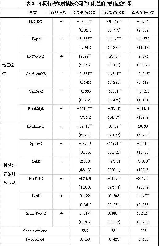 表3显示了在不同行政级别下,地区经济状况变量和城投公司财务状况变量对城投债信用利差的影响。