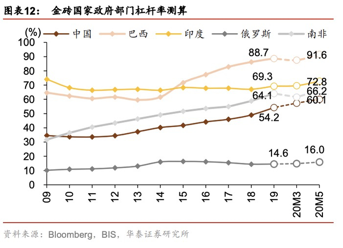 新兴市场经济体中,中国宏观杠杆率水平上升约20 Pct,巴西、俄罗斯、印度的宏观杠杆率上升幅度小于中国。
