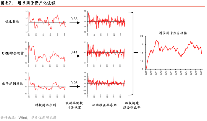 为了保证与前期报告中的口径一致,本文同样采用波动率倒数加权法来确定底层资产权重。具体而言,增长因子资产化流程如下:1、获取恒生指数、CRB综合现货指数以及南华沪铜指数的对数同比序列,根据对数同比序列的波动率倒数来确定权重,也即波动率越大的资产,权重越低;2、基于波动率倒数权重将各资产环比收益率线性加权,得到资产组合收益率,其净值走势就是资产化后的增长因子的走势。