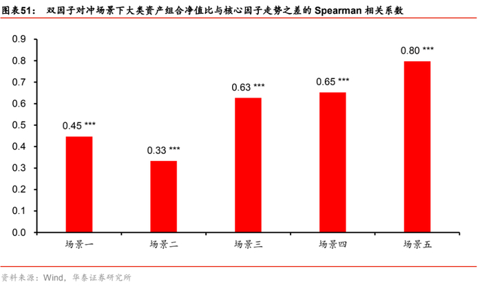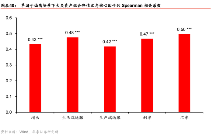 进一步,计算各测试场景下净值比与目标因子的秩相关系数,结果显示,五个宏观因子与对应的净值比走势均在1%显著性水平下正相关,说明本文提出的宏观风险配置模型能够及时的应对宏观环境的变化。而且需要强调的是,无论哪种测试场景下,所有因子都参与到了宏观风险配置的过程中,其中,核心因子体现在效用函数惩罚项中,次要因子体现在约束项的中性条件中,因而任何一个因子对金融资产的解释力偏弱,都会导致估计的风险载荷系数不可靠、不稳定,从而对优化结果产生较大影响。从这个意义上说,本文构建的五因子体系,确实是金融资产的主要底层驱动力,并且解释了大部分的宏观风险。