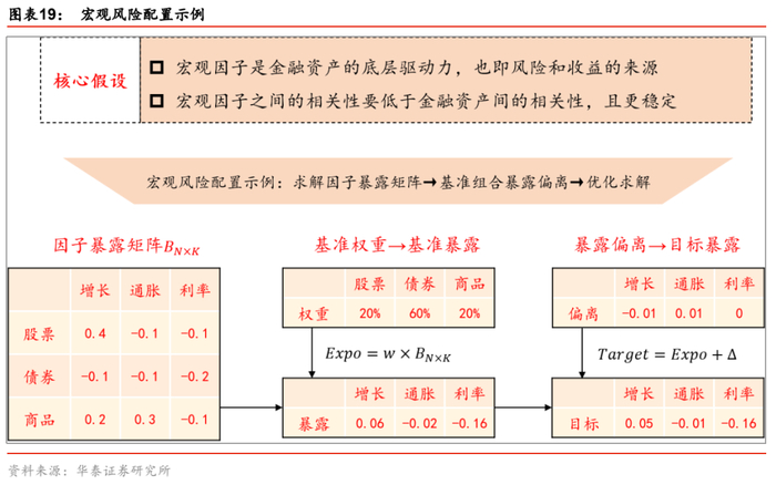 综上,宏观风险配置模型本质上提供了一套将宏观观点落地的定量方案:尽管资产配置实践中,投资者或多或少都会参考宏观环境来做投资决策,比如在经济扩张期超配股票和商品,在经济收缩期超配债券,但这种决策更多是定性层面,而且无法应对复杂多维的宏观环境。如果想构建一个既能适配特定宏观环境,又能达到较优风险收益特性的资产组合,则需要借助更精细化的定量工具,这便是宏观风险配置模型的优势。