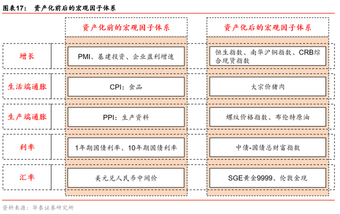1. 资产化前的宏观因子体系逻辑更直观,契合传统的自上而下的研究视角,主要用于宏观环境跟踪,观点发布。