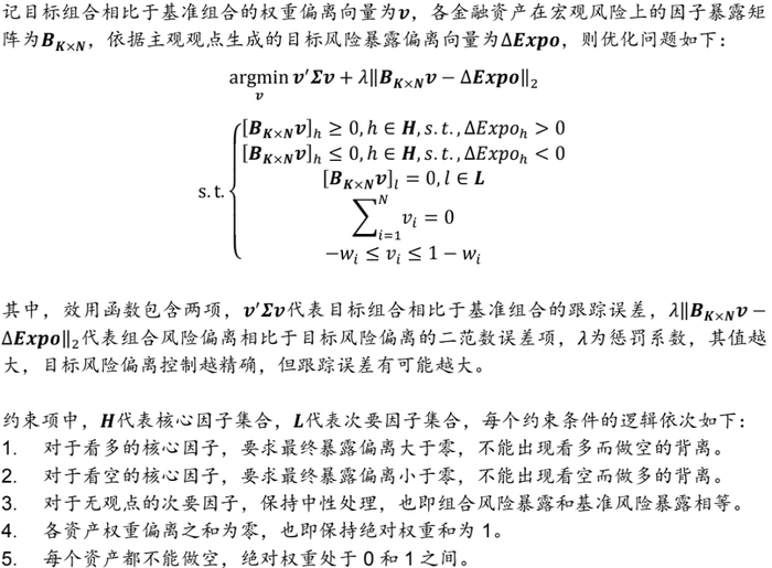 (5) 资产配置优化:以基准组合风险暴露为锚,根据对未来宏观环境走势的预判,设定核心因子上的目标偏离,同时保持次要因子的风险暴露不变(也即次要因子中性化处理),通过优化模型求解资产组合权重,使得新组合在各个风险上的暴露满足目标约束。