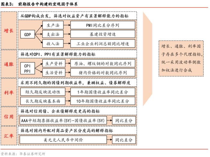 综上所述,本文构建了由增长、生活端通胀、生产端通胀、利率、汇率组成的宏观因子体系,每个因子维度都有资产化前和资产化后之分,具体而言: