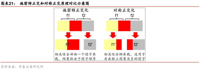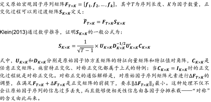 已有文献对构建正交的宏观因子体系开展了诸多探索:Invesco(2017)对多资产收益率序列开展主成分分析,将各主成分视作宏观因子;尽管主成分之间严格正交,但滚动区间内的主成分分析结果并不稳定,更无法保证可解释性;Two Sigma(2018)同样将宏观因子体系分为了不同层次,并对不同层次间的因子开展施密特正交化,但是该研究并未提及如何消除不同层次内各因子之间的共线性;Klein(2013)曾介绍过另一种不同于施密特正交化的方法——对称正交化,原理如下: