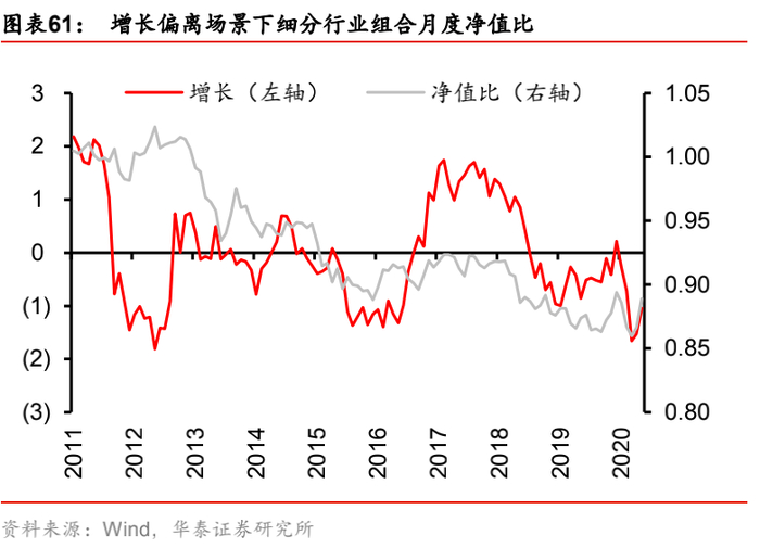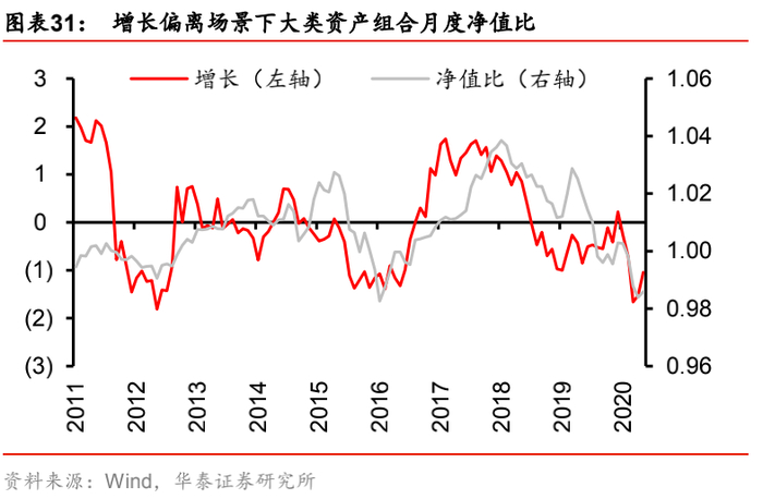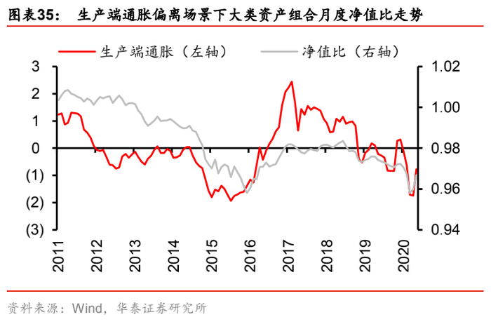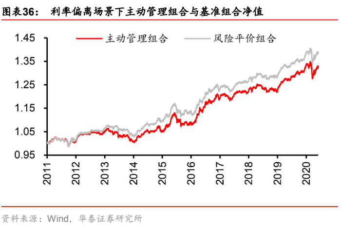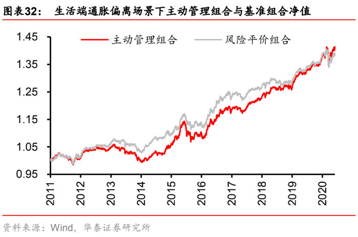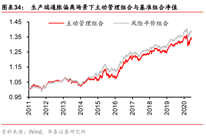 实证结果表明,五个测试场景下,净值比走势与目标因子走势基本一致,也即目标因子上行时,主动管理组合因为“正确”地做多该因子而跑赢基准组合,净值比增加;而当目标因子下行时,主动管理组合因为“错误”地做多该因子而跑输基准组合,净值比下滑。其中,净值比与目标因子走势吻合程度更好的是增长和生产端通胀因子。