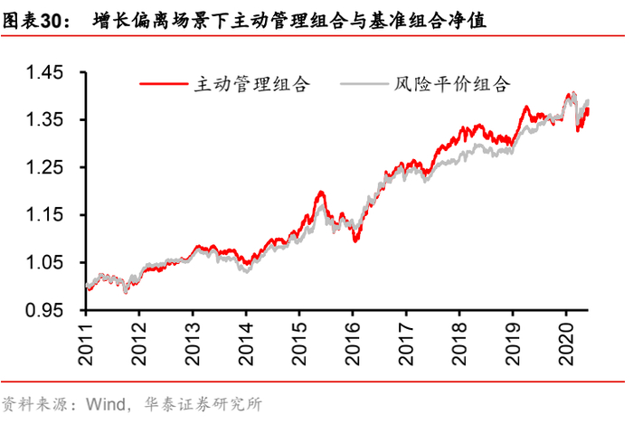 2. 双因子对冲场景:选择一对核心因子,设定两者的目标风险偏离方向相反,其余三个次要因子的目标风险暴露不变。比如认定增长和生活端通胀是主导资产价格变动的核心风险,并且始终超配生活端通胀因子,低配增长因子,那么当宏观环境处于增长下行,通胀上行状态时(与假想场景一致),主动管理组合应该跑赢基准组合;反之当宏观环境处于增长上行,通胀下行状态时(与假想场景背离),主动管理组合应该跑输基准组合;同样地,主动管理组合相比于基准组合的超额收益表现对增长、生活端通胀因子的变化反应越灵敏,走势越一致,说明宏观风险管理的效果越精细。