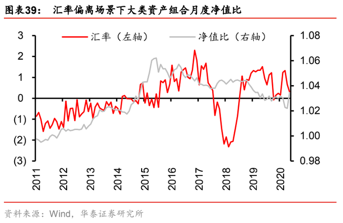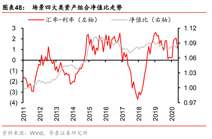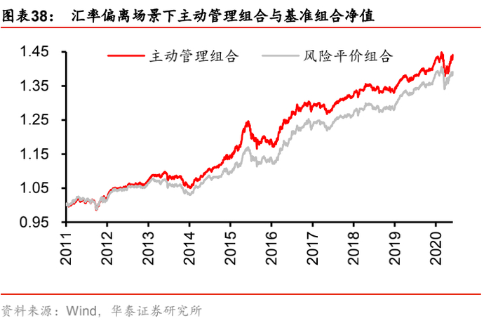 (4) 场景四:“汇率-利率”,即汇率因子的风险暴露偏离设定为+0.002,利率因子的风险暴露偏离设定为-0.002(相当于始终做多汇率,做空利率)。该场景对应的逻辑是:国内利率下行,资金回报率降低,对外资的吸引力减弱,本币贬值(美元对人民币中间价走高),反之同理。